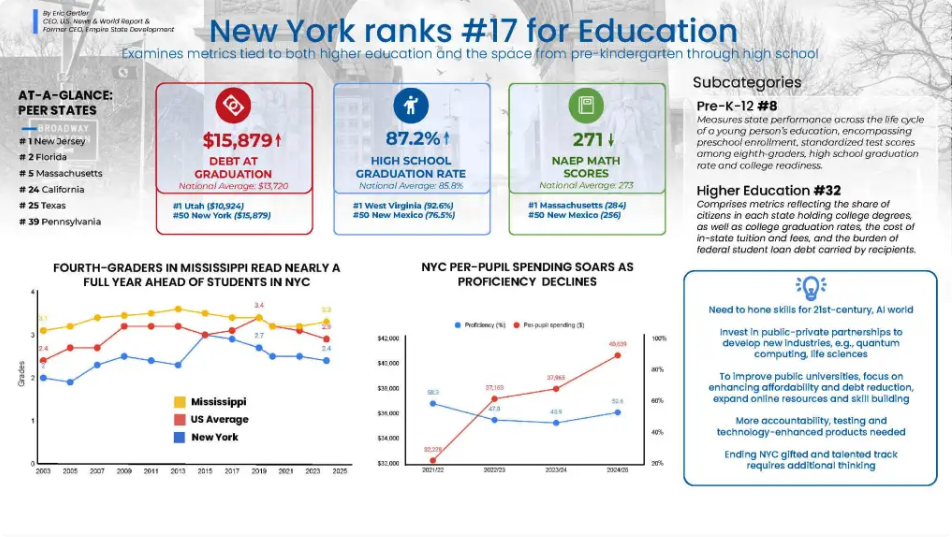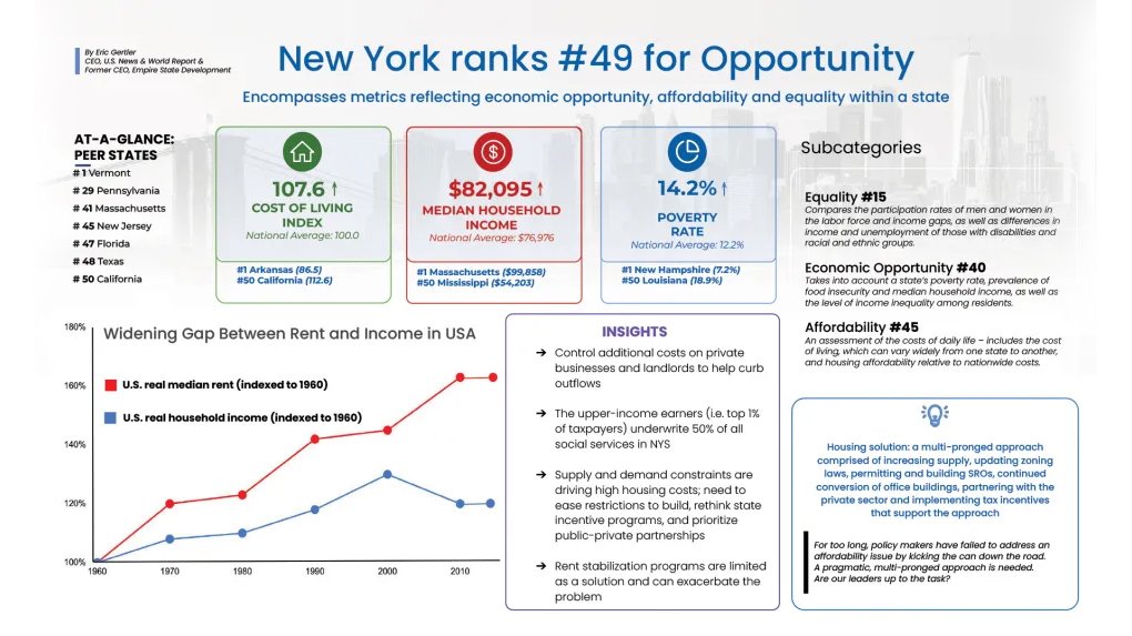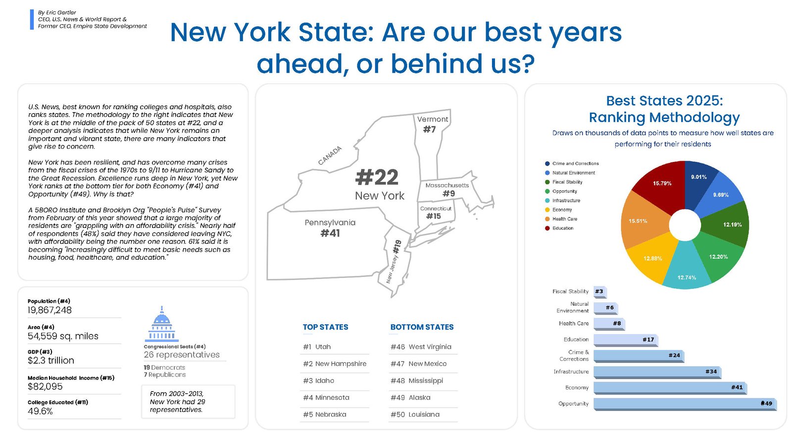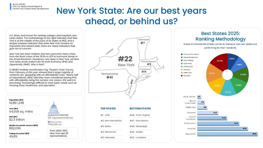To assess the Empire State’s level of affordability, they both turned to U.S. News & World Report’s annual Best States rankings, compiled annually for a decade. They were right to rely on the data. As former Mayor Mike Bloomberg says, “In God we trust. Everyone else, bring data.”