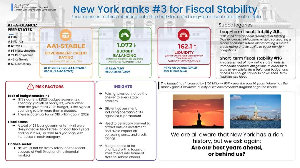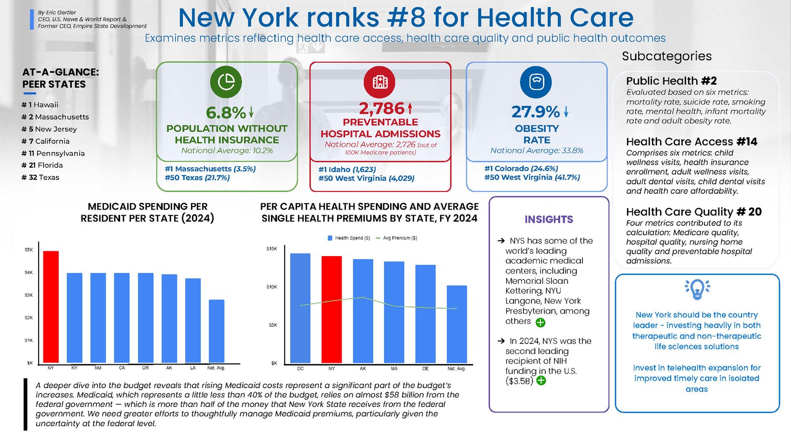 As to the other categories, New York ranks 34th for its infrastructure, 24th for crime and corrections, and 17th for education. The state ranks in the top 10 for three categories: eighth for health care, sixth for its natural environment and third for fiscal stability.