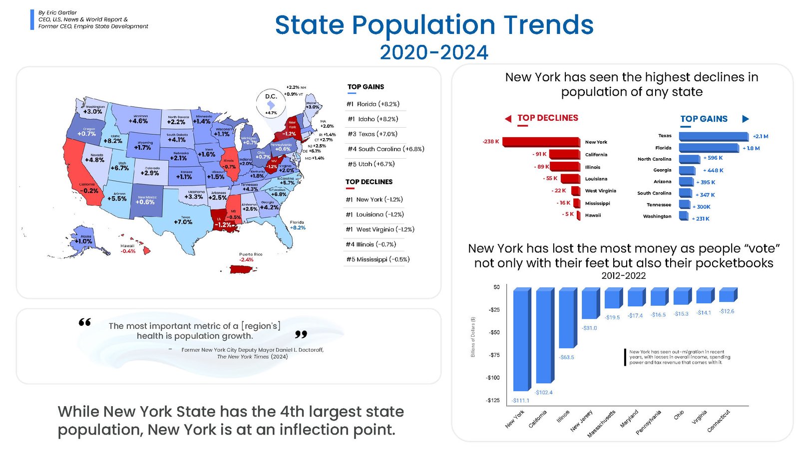 A deeper look reveals that New York is at a concerning inflection point. As the fourth largest state in terms of population, with the third largest economy, New York has many important and positive attributes. But, if as former Deputy Mayor Dan Doctoroff once wrote that “the most important metric of a [region’s] health is population growth,” then New York State is sadly going in the wrong direction.