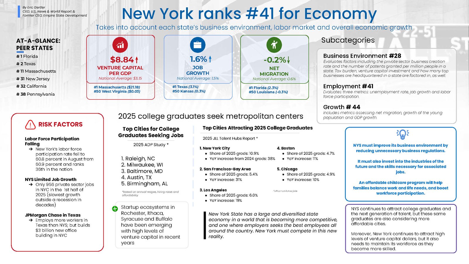 New York ranks 41st for its economy — which takes into account a state’s business environment, labor market and overall economic growth. New York’s large and diversified economy, enjoying high levels of venture capital investments, among other indicators, is the envy of many states. But it is also grappling with falling labor force participation rates, job growth slightly above the national average and a difficult business and regulatory environment.